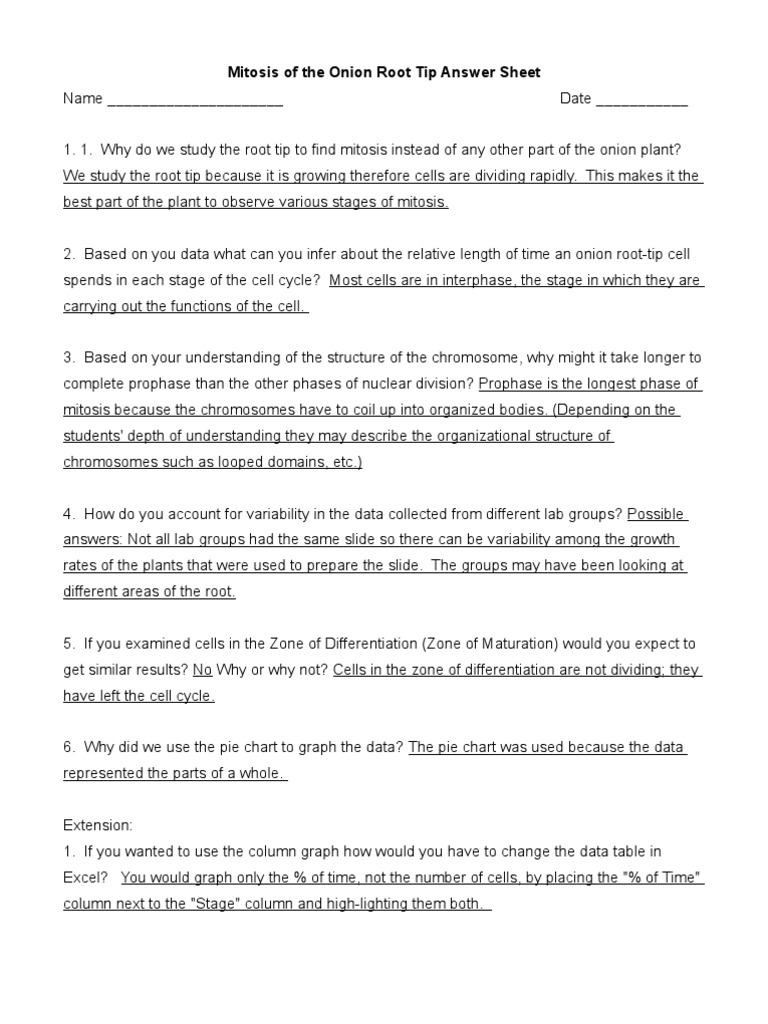 An introduction to light microscopy adapted from u201cfoundations of biology i; Onion root tip mitosis refers to a type of cell division where the parent cell produces two identical daughter cells resulting in two diploid daughter cells. The cells at the tip of the roots are actively dividing, and cell division mitosis and the cell cycle a chromosome and sister chromatids key points about chromosome structure a chromosome consists of dna that. The root cap contains cells that cover and protect the underlying growth region as the. Mitosis in onion root tip experiment mitosis in onion root tip experiment von thomastktungnung vor 1 jahr 5 minuten, 24 sekunden 153.028 aufrufe real photographs of all the , mitotic , stages taken by me. Because of the rapid rate at which onion root tips grow as a result of rapid cell division, it's possible to observe and identify the different stages of. The root cap contains cells that cover and protect the underlying cell that are actively dividing but not yet in mitosis are said to be in interphase, during which time the dna is copied and the cell is otherwise. Other results for onion root tip mitosis lab answer key: Onion root tip mitosis lab answers mitosis is the division of the nucleus to form two genetically identical nuclei. The genetic information of all organisms resides in the individual dna molecules or chromosomes. Learn onion root tip cells with free interactive flashcards. Better understand the process and stages of mitosis. ** the chromosomes can be stained to make them more easily observable the cells at the tip of the roots are actively dividing, and thus many cells will be in the stages of mitosis ** the roots are easy to grow in large numbers the tips can be prepared in a way that allows them to.